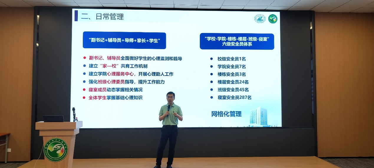 “家校齐育人”板块,孙书记介绍了23级本科录取的基本情况,学院本科生在校期间至少有三位老师(辅导员、教师班主任、5211导师)指导,并且由辅导员、导师、家长和学生共同形成管理体系,实现网格化管理,抓牢日常考核、建立激励措施。紧接着,孙书记介绍了本科生培养计划与学分细则,解释了加权成绩以及保研要求,强调了学习纪律和学分管理办法。