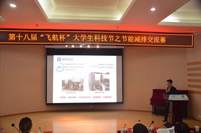 宣读比赛规则后,决赛答辩正式开始。首先上台答辩的项目是农村饮用水净化用生物炭太阳能热解装置装置,答辩人介绍了一种新型、低成本的太阳能热解装置,其自动化、可循环的特点获得了评委老师的一致好评。在随后的答辩过程中,各个参赛队伍的作品让我们耳目一新,姚莹同学带来了基于超声波切换技术的风冷式空调节能装置,简亲平同学介绍了一种新能源水上移动式组合智能净水装置。参赛作品涉及到空气净化器、发电装置、交通指示、废热利用等多个方面。