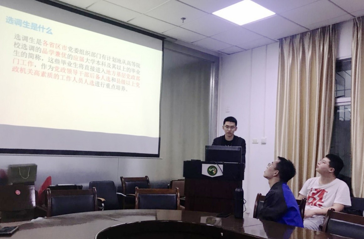 习炜昊同学以“扎根基层,走好选调之路”为主题,从什么是选调生、选调生招考要求、选调生笔试面试技巧等方面全面介绍了选调生这一职业发展方向,同时,通过分享他顺利通过选调生选拔的备考经验进一步鼓励同学们积极准备,为有志于选择选调生道路的同学们提供了十分详细的指导。