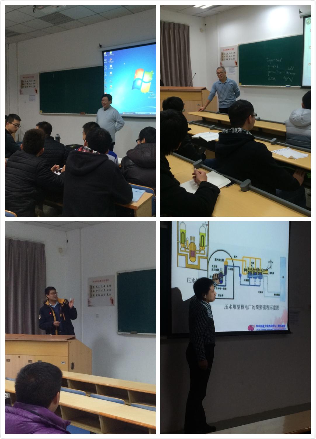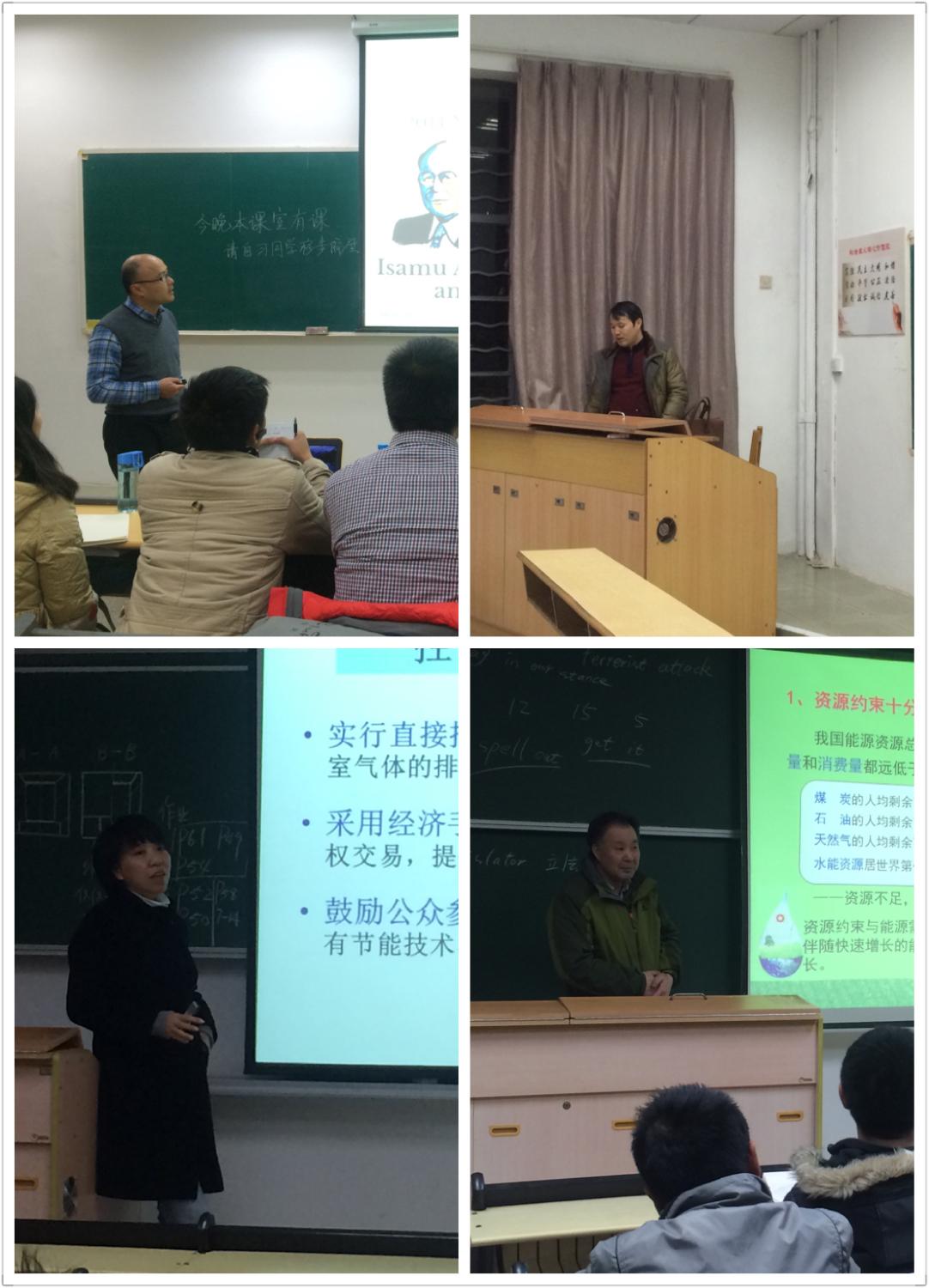 《学科基础引论》课程为一年级学生开设,课程为16学时,实行15人左右的小课堂教学。2015-2016第一学期全学院共开设26个课堂。授课内容涵盖了专业背景知识介绍、科技动态、新能源及最新政策、节能技术、创新能力培养及科技竞赛辅助指导、创新思维及创新方法培养、节能减排案例分析等(部分教授授课情况见下图)。授课方式采用课程讲授、讨论、主题研讨、现场讲解等。