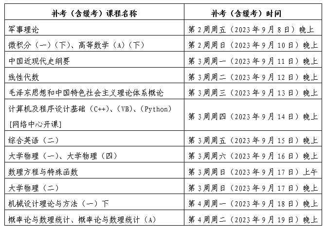 二、补考(缓考)时间为2023~2024学年度第一学期的第2周周三(2023年9月6日)至第4周周五(2023年9月22日)。