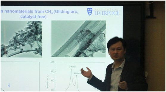 屠昕教授首先对英国各个城市的地理位置以及利物浦当地的文化特色进行了简要的介绍,接下来就结合等离子体处理工艺相对于传统热化学处理工艺的优势,提出了利用低温等离子体协同催化二氧化碳、甲烷等气体转化为高附加值化学品的思路。并针对其反应装置图、等离子体协同催化转化的选择性、转化率以及低温等离子体装置的能效等方面进行了详细的讲解。此部分工作内容非常有创新性,已发表在了Angew Chem Int Ed Engl和Applied Catalysis B: Environmental等国际顶级期刊上。此外,屠昕教授还将低温等离子体处理应用在了生物质热解焦油的转化上。他通过将焦油的模型化合物甲苯通过滑动电弧等离子体发生器处理后发现甲苯得到了有效的分解,这为生物质热解焦油的处理提供了新的思路,并引起了在场师生的激烈讨论。最后,屠昕教授还介绍了等离子体在材料处理、污染物处理、农林业等领域的应用现状与前景,极大开阔了大家对等离子体应用领域的认识。
