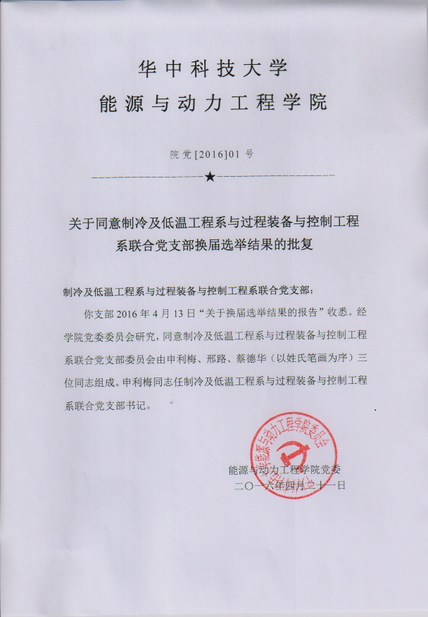 关于同意制冷及低温与过程装备控制联合党支部换届选举结果的批复