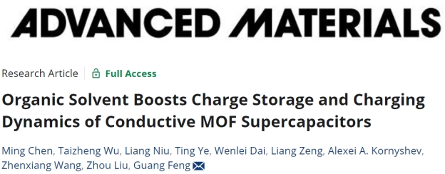 05月16日,《先进材料》(AdvancedMaterials)以研究长文形式刊发了学院冯光教授团队关于导电MOF超级电容器的最新研究成果。论文题目为《有机溶剂提升导电MOF超级电容器的电荷存储和充电性能》(Organic Solvent Boosts Charge Storage and Charging Dynamics of Conductive MOF Supercapacitors);6165金沙总站官方入口煤燃烧与低碳利用全国重点实验室为第一单位。