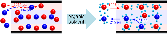 冯光教授团队以开发的恒电势分子模拟为主要研究手段,研究有机溶剂对c-MOF离子液体超级电容器的电荷储存和充电动力学的影响。模拟预测加入摩尔比(IL/ACN)为0.107的有机溶剂ACN时,超级电容器体系的储能容量翻倍且充电速度可提高约6倍。随后通过优化实验工艺,合成了高结晶度的c-MOF晶体(比表面积为1023 m2g-1超过了此前文献报道的最高值884.7 m2g-1,更接近理论值1153 m2g-1),并发展了连接分子模拟与宏观电化学实验的多尺度模型,进一步验证了分子模拟的预测结果。该储能性能提升的机理在于溶剂起到两个关键作用:首先是充当“ionophobic agent”,控制孔的疏离子性并打破阴阳离子间的耦合作用,促使储能容量提升;其次作为“ion traffic police”,通过创造干扰很少的离子传输“高速公路”来疏通复杂的共离子和反离子运动路径,从而加快充放电。