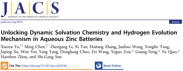 06月13日,《美国化学会志》(Journal of the American Chemical Society)以刊发了学院冯光教授团队与厦门大学化学化工学院孙世刚院士团队乔羽教授、邹业国博士关于水系锌离子电池的最新合作研究成果。论文题目为《揭秘水系锌电池中的动态溶剂化演变和析氢机制》(Unlocking Dynamic Solvation Chemistry and Hydrogen Evolution Mechanism in Aqueous Zinc Batteries)。