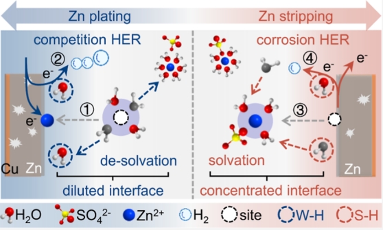 该工作不仅深化了对固液界面双电层中溶剂化动态及析氢机制的理解,而且提出将界面溶剂化突变度作为衡量水系锌离子电池性能提升的指标,为设计高性能水溶液电解液体系提供了崭新的理论基础和调控策略。