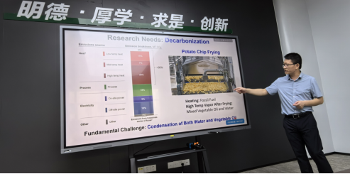 首先,戴贤明副教授带来了主题为推进热封装和脱碳系统的能源可持续性的讲座。戴老师分别从两种主要相变传热方式:蒸发和冷凝出发,介绍现有表面材料的研究前沿及其在电子领域与能源领域的应用前景。两种传热机制对界面材料的要求不同,超湿润的表面有利于蒸发,而超排斥的表面有利于冷凝,戴老师详细的讲述了两种换热方式的原理与研究挑战,强调了基础理论、基础原理的理解对于科研的巨大帮助,介绍几种具有特殊蒸发和冷凝能力的创新表面与换热系统,并由此推出其在能源回收利用领域及电子器件散热领域中的应用。