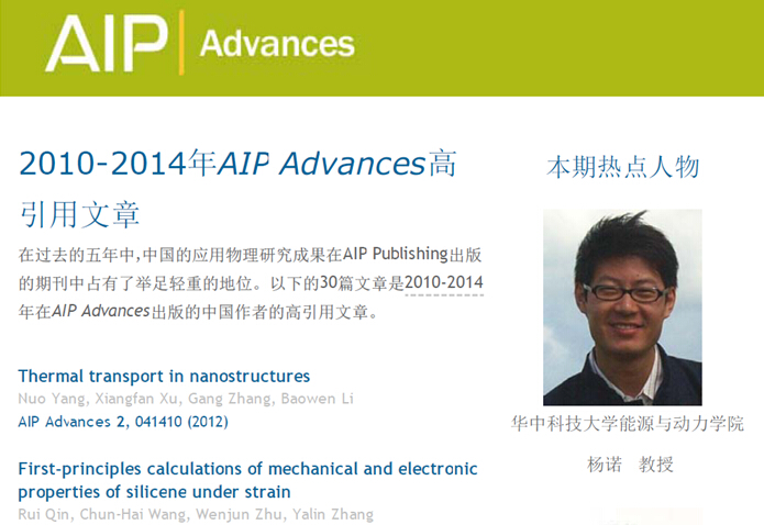 近年来,中国的应用物理研究逐渐发展,并开始在AIP的出版中占据举足轻重的地位。我院杨诺教授及其合作者的文章“Thermal transport in nanostructures”入选AIP最新评选出的30篇从2010年到2014年间AIP Advances出版的中国作者的高引用文章,而杨诺教授本人也被评为该期热点人物。在热烈祝贺杨诺教授的同时,也期待他指导的纳米传热实验室再接再厉,在应用物理和能源利用领域做出更多贡献。