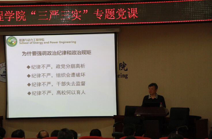 陈刚书记分别从何为三严三实、三严三实提出背景、内涵意义、不严不实表现以及如何践行三严三实等几个方面展开谈论。他指出“三严三实”专题教育是党的群众路线教育实践活动的延展深化;是高等学校从严治党的要求;是严明党的政治纪律和政治规矩的重要抓手。