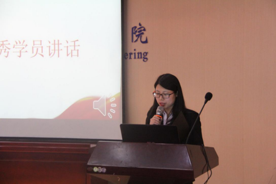 会议第四项,优秀学员代表崔晓宁发言。她说道:首先要做一名合格党员。始终头脑清醒,时刻不忘自己是一名共产党员;其次要要勤奋学习,牢固树立终身学习的理念,认真学习党的方针政策和业务知识;然后要爱岗敬业,坚持干一行、爱一行,切实发挥共产党员的先锋模范作用。最后她倡议在座的各位同志:立足本职、不断学习、勇于创新,乐于奉献,以自己的实际行动,来实现入党时的庄严誓言,使自己真正成为一名不仅仅是合格的更是优秀的共产党员,为党旗增辉,为共产主义伟大理想而不懈奋斗。
