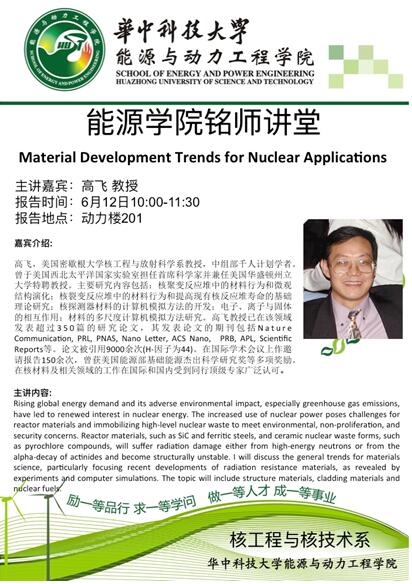 主讲嘉宾高飞,美国密歇根大学(University of Michigan)核工程与辐射科学系(Nuclear Engineering & Radiological Sciences)教授,中组部“”学者。高飞教授曾于美国西北太平洋大学国家实验室担任首席科学家并兼任美国美国华盛顿州立大学特聘教授。主要研究方向包括:核聚变反应堆中的材料行为和微观结构演化;核裂变反应堆中的材料行为和提高现有核反应堆寿命的基础理论研究;核探测器材料的计算机模拟方法的开发;电子、离子、与固体的相互作用;材料的多尺度计算机模拟方法研究。高飞教授已在该领域发表超过350篇的研究论文,其发表论文的期刊包括Nature Communication,PRL,PNAS,Nano Letter,ACS Nano,PRB,APL,Scientific Reports等。论文被引用9000余次(H-因子为44)。在国际学术会议上作邀请报告150余次,曾获美国能源部基础能源杰出科学研究奖等多项奖励。在核材料相关领域的工作在国际和国内受到同行顶级专家的广泛认可。