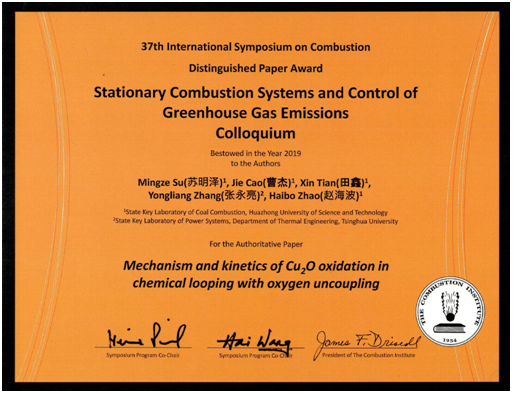 本站讯(通讯员:王家丽)2019年3月,煤燃烧国家重点实验室赵海波教授接到国际燃烧学会通知,该课题组在第37届国际燃烧会议上做口头报告并被发表在国际燃烧学会会刊(Proceedings of Combustion Institute,燃烧领域顶级期刊,IF=5.336)上的论文“Mechanism and kinetics of Cu2O oxidation in chemical looping with oxygen uncoupling”获得杰出论文奖(Distinguished Paper)。该论文的作者为苏明泽(第一作者,17级博士生)、曹杰(15级硕士,已毕业)、田鑫(15级博士,在站博士后)、张永亮(12级硕士,现清华大学能源与动力工程系攻读博士学位)、赵海波(通讯作者)。
