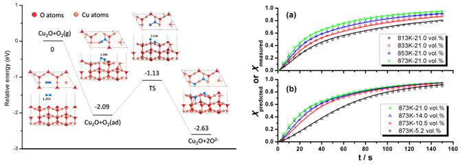 与空气不直接接触,从而实现CO2的内分离与富集。氧载体吸氧与释氧的反应机理及动力学关系到化学链反应器的设计、运行和优化,是化学链技术发展需要解决的关键科学问题之一。在该获奖论文中,作者结合量子化学模拟、动力学实验和理论分析系统的研究了Cu基氧载体的氧化机制及反应动力学等问题,确认了氧化产物的外延性生长特性并分析了晶粒尺度上表面反应与内部离子传输相互竞争的定量关系,给出了实验结果中两阶段反应过程的理论解释,为下一步构建宏观模型、裁剪设计氧载体奠定了基础。