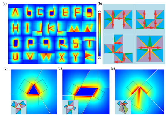 基于团队前期提出的幻象热学方法体系(Illusion thermotics, Adv. Mater. 2018, 30, 1707237),研究团队设计了区域内各向异性的导热系数张量,实现了极限热流操控和定向传热,并通过数值模拟和红外实验加以验证,进而发展了区域变换热学方法,能够在各个子区域单独进行幻象热学设计,操控热流实现整个英文字母表的热幻象。有趣的是,该方法不仅可以实现文字的热打印,还可以打印图像、制作动画、显示加密红外信息等。