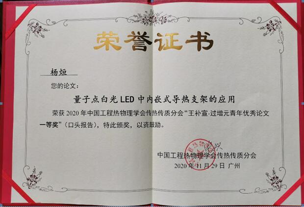2020年中国工程热物理学会传热传质学术会议暨国家自然科学基金项目进展交流会于11月27日至29日在广州举行。推荐青年优秀论文口头报告经过专家评委的评审,我院2020级研究生杨烜以优异的表现荣获“王补宣-过增元青年优秀论文一等奖”(口头报告)(全国今年唯一的一等奖)。获奖论文的题目为《量子点白光LED中内嵌式导热支架的应用》,指导老师为罗小兵老师,该论文设计了一种新型的量子点白光LED的封装结构,有效增强LED的散热,能够使LED在工作时的工作温度降低30℃,并且维持了它原有的各项光学性能基本不变,具有一定的创新性与应用潜力。这也是我校首次在中国工程热物理学会传热传质学术会议中获得该奖项。