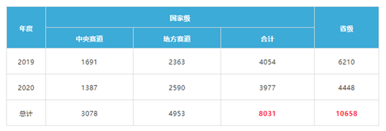 在2019年分赛道认定了4054个国家级一流本科专业建设点(其中中央赛道1691个,地方赛道2363个)、6210个省级一流本科的基础上,2020年分赛道认定了3977个国家级一流本科专业建设点(其中中央赛道1387个,地方赛道2590个)、4448个省级一流本科专业建设点。(省级数据中包含部分已升级为国家级的专业数)