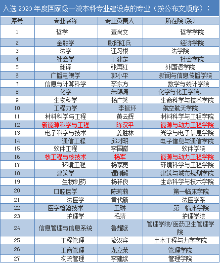 (本站讯 通讯员 周曼婷)近日,教育部发布《教育部办公厅关于公布2020年度国家级和省级一流本科专业建设点名单的通知》(教高厅函〔2021〕7号)。其中,我院 “新能源科学与工程”、“核工程与核技术” 入选“双万计划” 2020年度国家级一流本科专业建设点。加上2019年已入选的“能源与动力工程”,我院现有的三个专业均入选“双万计划” 国家级一流本科专业建设点。