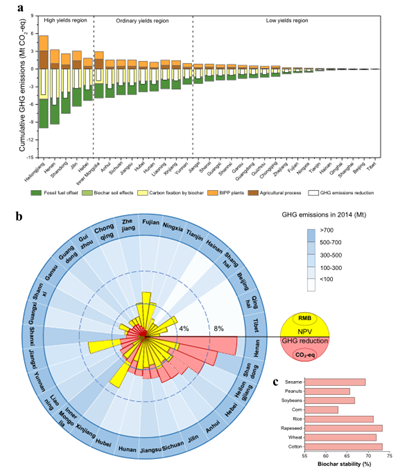 为了实现《巴黎协定》中商定的将全球温度上升有效地限制在2°C或1.5°C的目标,负排放技术(NETs)的广泛应用被认为是必不可少的。两种主要依赖光合作用的NETs因能同时提供能源和潜力巨大而备受瞩目:(1)耦合碳捕集与封存(CCS)的生物能源技术(BECCS),以及(2)生物炭(Biochar)的生产和封存。考虑到BECCS可能还需要多年时间才能成熟,该研究首先关注了更容易在中国实施的生物炭(Biochar)负碳技术:生物质中速热解多联产(BIPP)。该技术可生产生物炭的同时提供有较好经济性的可燃气和电力。研究发现,若全国碳市场建立,BIPP系统无需补贴即可盈利,若立即应用,其在全国范围内的应用可以使2030年单位国内生产总值的碳排放量比2005年减少2-61%,同时还可以显著减少空气污染物的排放。在2030年之后,考虑BECCS和Biochar的耦合利用和协调发展,到2050年可累计减少的温室气体排放可高达8620百万吨二氧化碳当量,对全球BECCS温室气体减排目标的贡献率为13%-31%。耦合情景比单独BECCS情景至2050年减排量多出近4555百万吨。该研究主要阐述中国负碳技术的部署对实现国家和全球温室气体减排目标的重要影响。该项工作得到了国家自然科学基金,煤燃烧国家重点实验室基金及中欧清洁与可再生6165金沙总站官方入口双一流研究基金的支持。