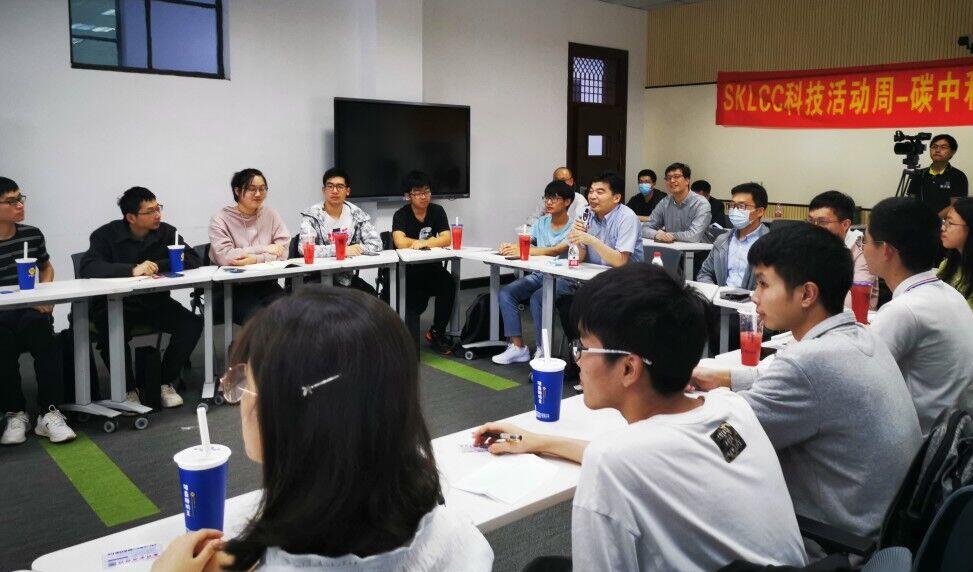 之后,讲堂中开展了同学们和老师们的交流互动环节,同学们就碳达峰碳中和相关的科技创新、市场行情以及学生就业等方面内容和5位博士后进行了深入细致的交流。