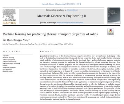 (通讯员 李牧川)2021年9月,能源和材料领域顶级期刊Materials Science and Engineering R (影响因子IF=36.214)刊发题为“Machine Learning for Predicting Thermal Transport Properties of Solids”的综述文章,第一作者和通讯作者分别为我院钱鑫教授和杨荣贵教授。