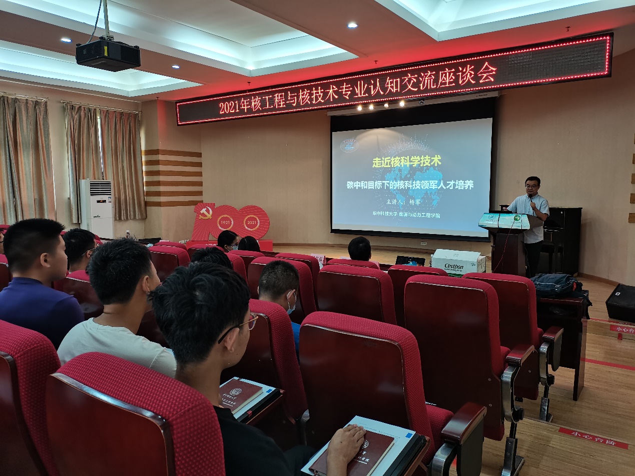 首先,学院副院长、核工系主任杨军老师做了题为《走近核科学技术——碳中和目标下的核科技领军人才培养》的讲座,介绍了核科学与技术的广泛应用,并提到,在当前碳中和目标及空天海洋极地探索的大背景下,核工程与核技术专业大有可为,勉励核工系的同学们在宝贵的四年中努力学习,学到受用终生的知识和能力。核工系副主任杨章灿老师深入浅出地介绍了核工程与技术专业,包括核专业的就业前景、往届毕业生去向、核专业的课程设置、奖助与实习等情况。其次,法学院胡帮达副教授做了题为《核共同体的行为规范和责任担当》的讲座,给同学们介绍了核共同体、核共同体的行为规范、核安全的基本原则和主要制度措施、核不扩散等内容,并科普了《国际原子能机构规约》、《不扩散核武器条约》等法律以及我国亟待出台的《中国的核安全》,进一步完善了核工系同学们的知识体系。最后,在场的核工系老师和同学们就大学期间的学习、保研、生活、科研等内容进行了互动交流,核工系学生代表甘澳同学分享了大学期间的经验和感悟。