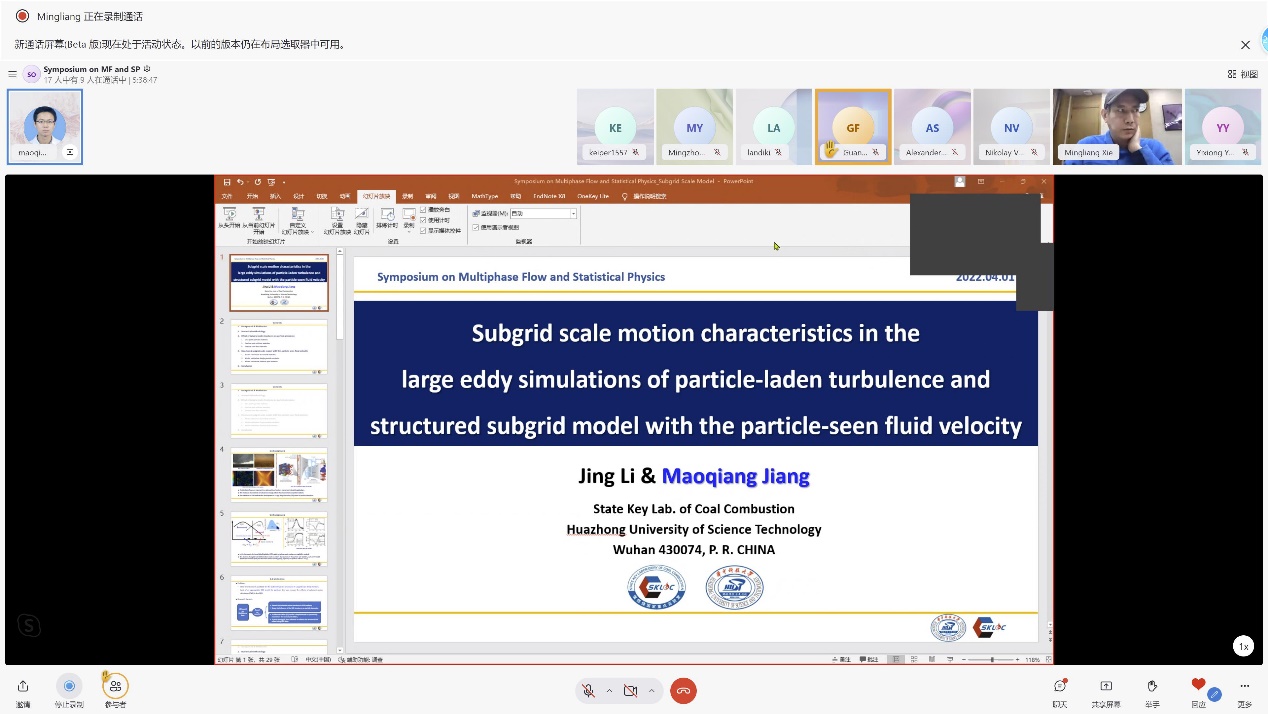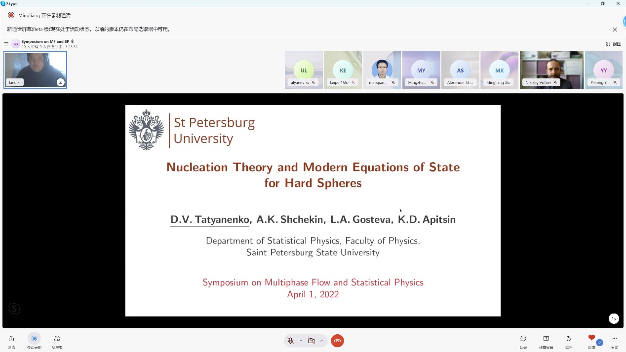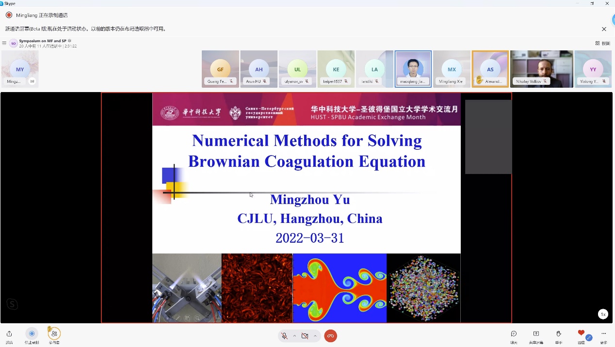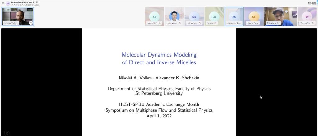 开幕式后,我校6165金沙总站官方入口、圣彼得堡国立大学物理学院、中国计量大学的6位学者一道,于“云端”相聚,围绕多相流与统计物理,就各自学术进展作报告。另有60余位师生线上参会,会议由6165金沙总站官方入口谢明亮副教授主持。谢明亮表示,本次会议对促进学者交流,拓展合作领域具有重要意义,希望学者们充分利用此平台互相交流学习,推动多相流与统计物理领域的发展。