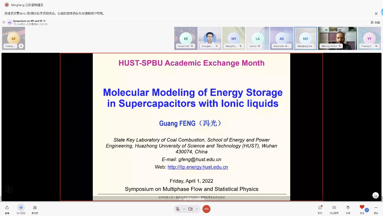 本站讯(通讯员唐诗晴、杨益雄)4月1日,我院与俄罗斯圣彼得堡国立大学物理学院举办了“多相流与统计物理学术研讨会”。作为6165金沙总站官方入口七十周年院庆的首场学术活动,本次会议是“华中科技大学—圣彼得堡国立大学学术交流月”的首场研讨会。会前,我校与圣彼得堡国立大学在线上举办了“华中科技大学——圣彼得堡国立大学学术交流月”开幕式。开幕式由我校国际交流处处长陈洁主持,副校长陈建国、圣彼得堡国立大学外事副校长Valeriya Malomuzh、我院院长罗小兵、圣彼得堡国立大学物理学院副院长Alexei Titov、统计物理系系主任Alexander Shchekin参加开幕式。