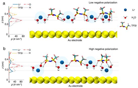 随着可再生能源和移动设备需求的快速增长,开发下一代电化学储能系统已成为关键。在电化学储能器件中,电解液是决定其储能性能的重要组成部分。与有机电解液相比,水系电解液具有不可燃性和低毒性的独特优势。然而,传统的水系电解液由于水的分解而仅有1.23 V的电化学窗口。高浓度的水系电解液——盐包水(WiS)电解液——可以克服这一限制,且已被证明能将电化学窗口拓宽至3.0 V以上,从而在锂离子电池、超级电容器和CO2还原反应中提供更高的性能。然而,在WiS电解液和电极之间的双电层界面的物理化学相互作用尚不清晰。