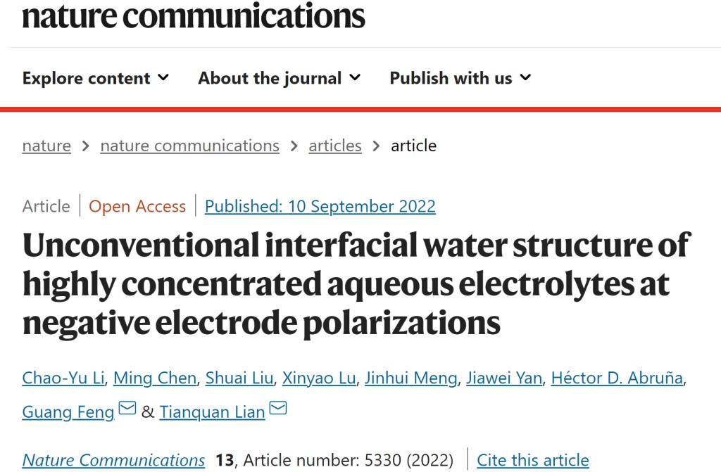 9月10日,《自然•通讯》(Nature Communications)以研究长文形式刊发了学院冯光教授团队与美国埃默里大学Tian-quan Lian教授团队关于盐包水电解液界面结构的最新合作研究成果。论文题目为《负极极化下高浓度水溶液电解液的非常规界面水结构》(Unconventional interfacial water structure of highly concentrated aqueous electrolytes at negative electrode polarizations)。