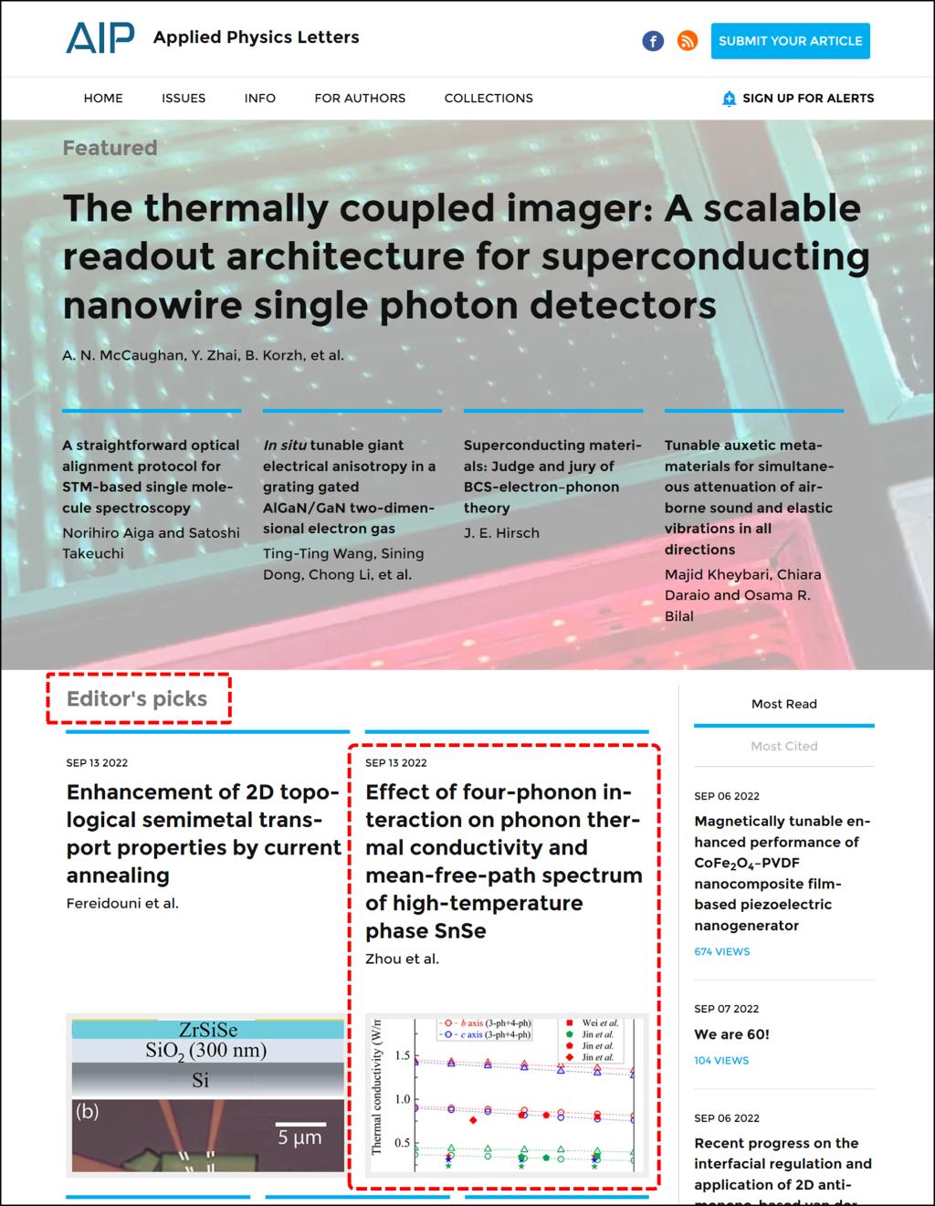 近日,刘德欢教授课题组(杨荣贵教授团队)在著名学术期刊《Applied Physics Letters》发表了题为:四声子相互作用对高温相硒化亚锡声子热导率及平均自由程的影响(Effect of four-phonon interaction on phonon thermal conductivity and mean-free-path spectrum of high-temperature phase SnSe)的研究论文。该论文被主编选为Editor'sPick文章,在期刊官网首页重点展示。