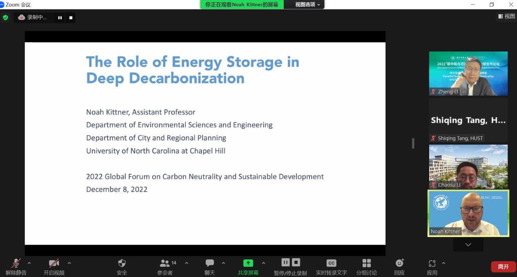 北卡罗来纳大学教堂山分校环境科学与工程系和城市与区域规划系助理教授Noah Kittner就“The Role of Energy Storage in Deep Decarbonization”(深度脱碳中能量储存的作用)作演讲。他介绍了新型抽水蓄能水力发电、重力储能、压缩空气储能等创新技术,并指出实现清洁能源转型需要构建智能弹性系统,加强适配可再生能源的基础设施建设,以创新技术驱动发展。