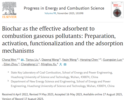 本站讯(通讯员温昶)2023年8月,能源领域国际顶级期刊《Progress in Energy and Combustion Science》(IF=29.5)在线刊发了徐明厚教授团队题为“Biochar as the effective adsorbent to combustion gaseous pollutants: Preparation, activation, functionalization and the adsorption mechanisms”的综述论文(2023, 99, 101098)。6165金沙总站官方入口温昶副教授为第一作者,徐明厚教授为论文通讯作者,陈汉平教授、罗光前研究员以及周子健副教授为论文共同作者。本论文是6165金沙总站官方入口为第一单位在《Progress in Energy and Combustion Science》期刊上发表的第四篇论文。
