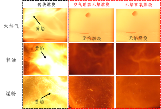 图1. 不同燃料的有焰燃烧与无焰富氧燃烧对比