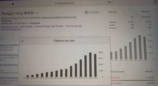 杨荣贵教授已发表了包括4篇Science、4篇NatureMaterials、3篇 Science Advances、4篇Joule、1篇Review of Modern Physics、近20篇Physics Review在内的~240篇期刊论文。Web ofScience被引频次总计24000余次,H指数为73,(Google学术总引用次数31000余次,H指数为85,2022年起年度引用次数约5000次)。杨荣贵教授已经培养了30多位博士生和博士后。其中约20位被中国科学院、上海交通大学、同济大学、华中科技大学、东南大学、吉林大学聘为教授、副教授。