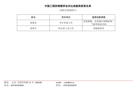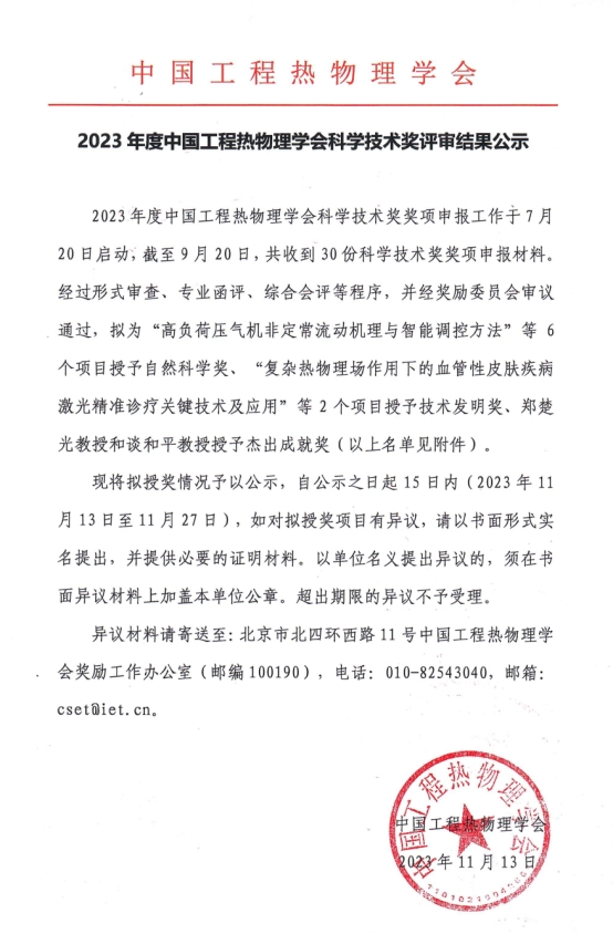 2023年度中国热物理学会科学技术奖评审结果已发布,本次评审共授予6个自然科学奖、2个技术发明奖及2个杰出成就奖,我院郑楚光教授在此次评审中被授予“杰出成就奖”。