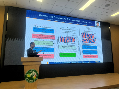 在13日上午的讲座中,Junichiro Shiomi教授首先阐述了材料信息学在导热声子调控和辐射微纳结构设计中的关键作用。材料信息学通过信息学手段或机器学习辅助材料的开发和研究,以预测或设计具有最高性能指标的材料。接着,Shiomi教授分享了其课题组在非周期性超晶格和多层超材料研究中取得的最新进展,以及背后的物理机理。在讲座的最后,Shiomi教授提出了建立材料信息学开放数据库的国际合作愿景,以促进全球范围内的学术交流与材料信息学的蓬勃发展。